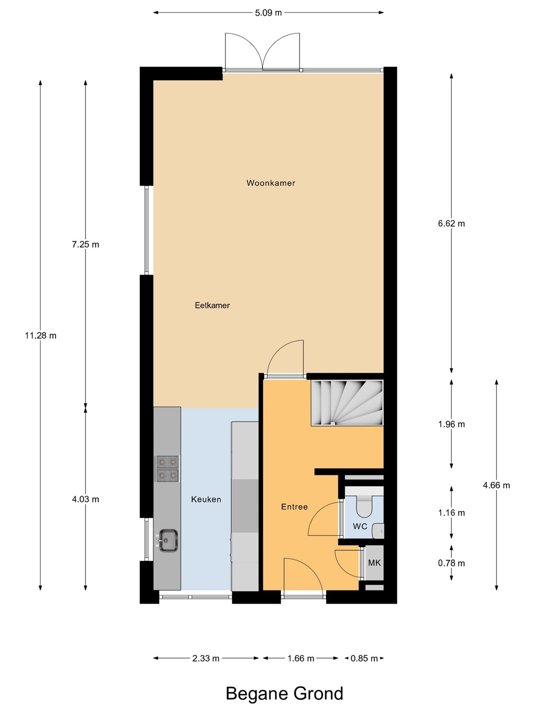 Begane grond: Entree met meterkast, toiletruimte met zwevend closet en een fontein, trapopgang, en toegang tot de ruime, lichte woonkamer met open keuken; de keuken is voorzien van AEG inbouwapparatuur waaronder een inductie kookplaat met 4 zones en een geïntegreerd afzuigsysteem, een vriezer, een hoge koelkast, een vaatwasser, een oven, een combi-oven en een kokend waterkraan van Quooker.
