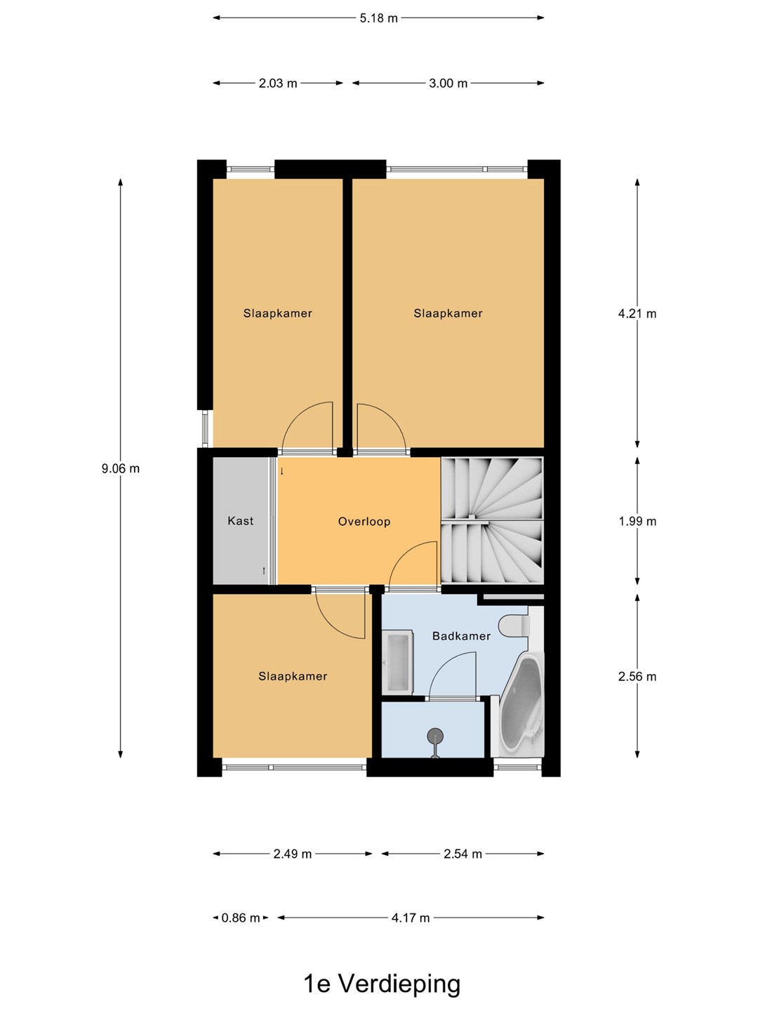 Eerste verdieping: overloop met ruime inbouwkast; drie slaapkamers; badkamer voorzien van ligbad, inloopdouche met regen douche en handdouche, toilet, design radiator en wastafelmeubel.