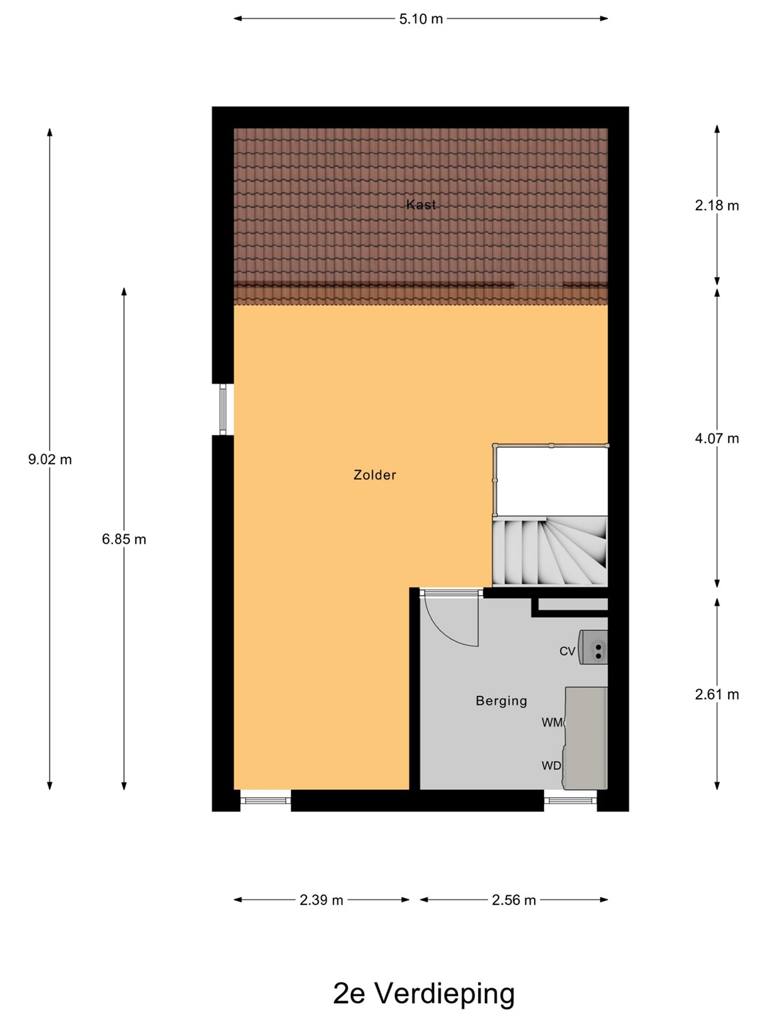 Tweede verdieping: een ruime (slaap)kamer met veel bergruimte en een ruimte met wasmachine en droger aansluiting en opstelplaats voor de CV.