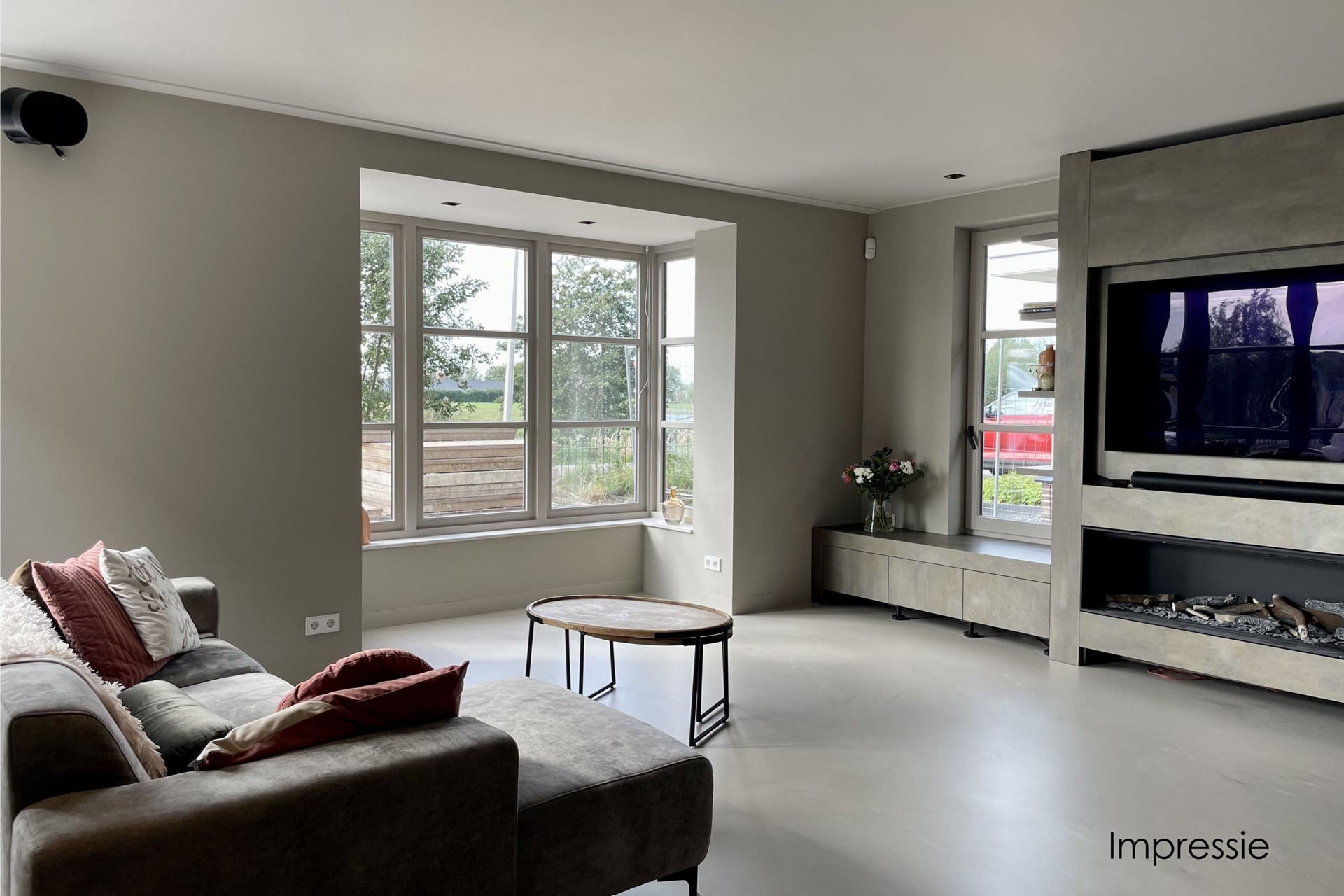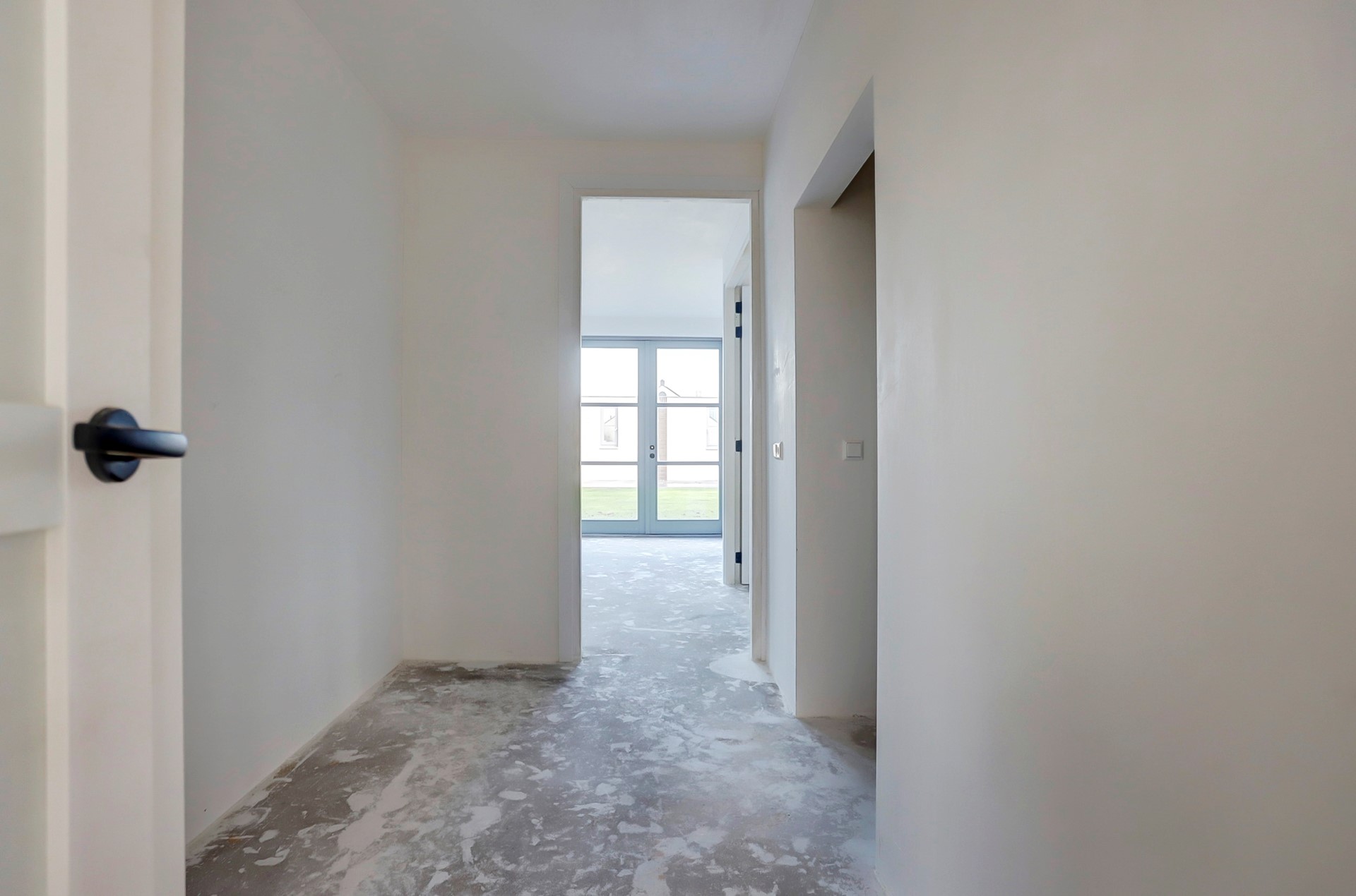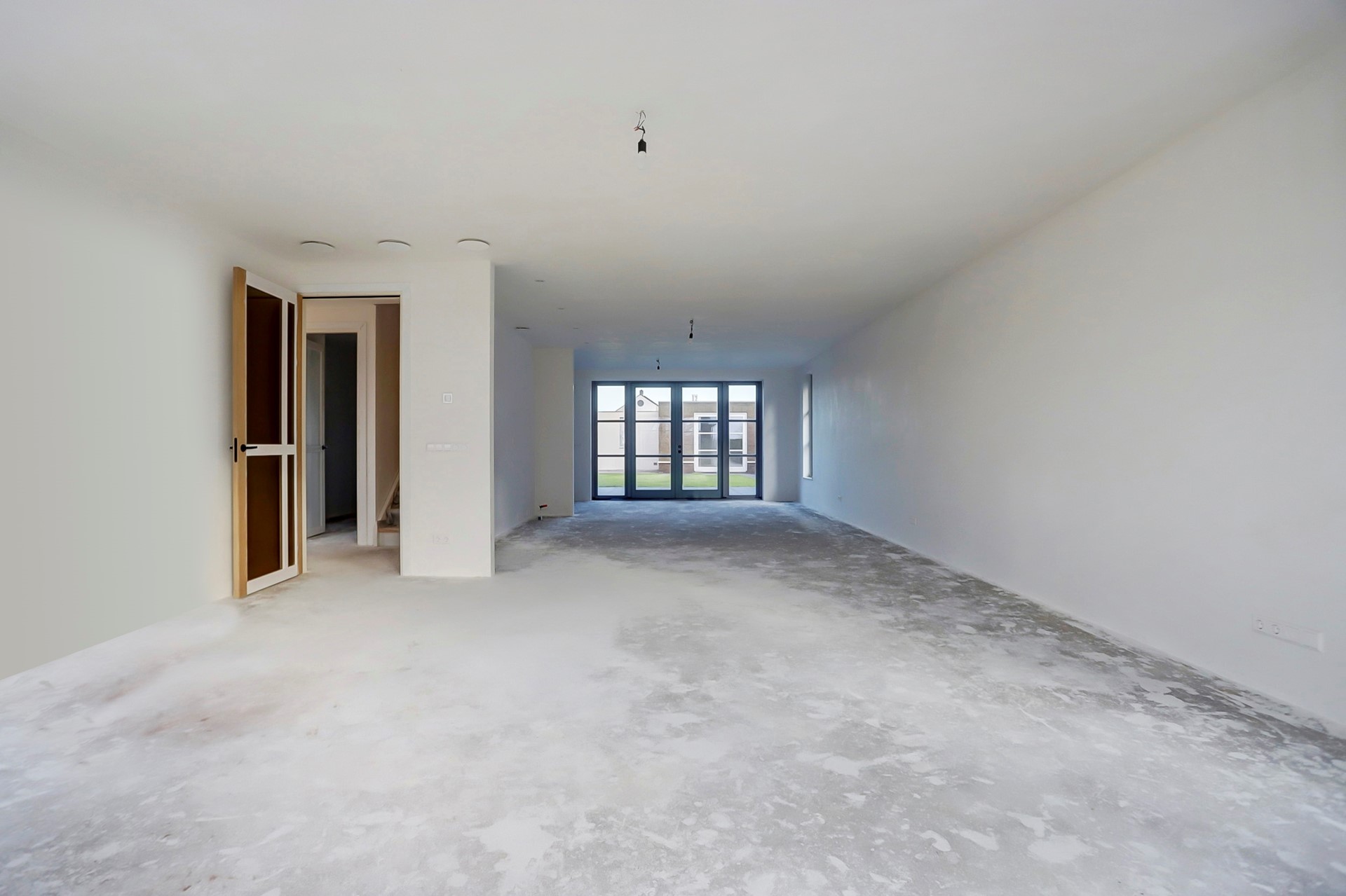 Begane grond: entree, L-vormige hal met toilet en meterkast. Vanuit de hal heeft u toegang tot de riante woonkamer welke aan de voorzijde gesitueerd is. Mede door de vele raampartijen rondom is er heerlijk veel lichtinval en heeft u tevens weids uitzicht op het aangrenzende polderlandschap. De openslaande deuren geven u toegang tot de achtertuin. In de mooie lichte open ruimte heeft u nog de volledige vrijheid om uw eigen droomkeuken te realiseren. De voorbereidingen voor een kookeiland zijn reeds getroffen.
