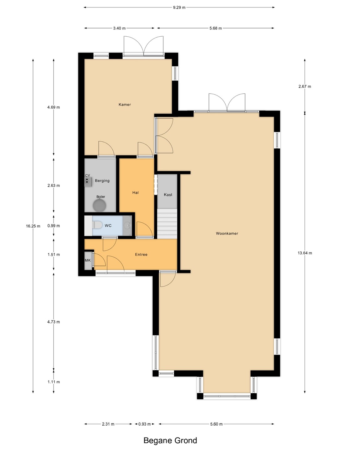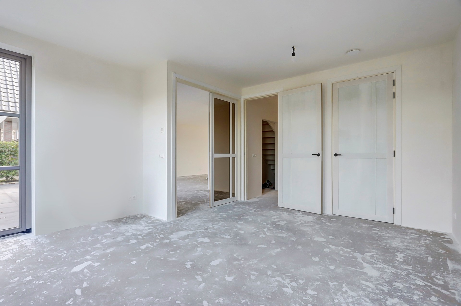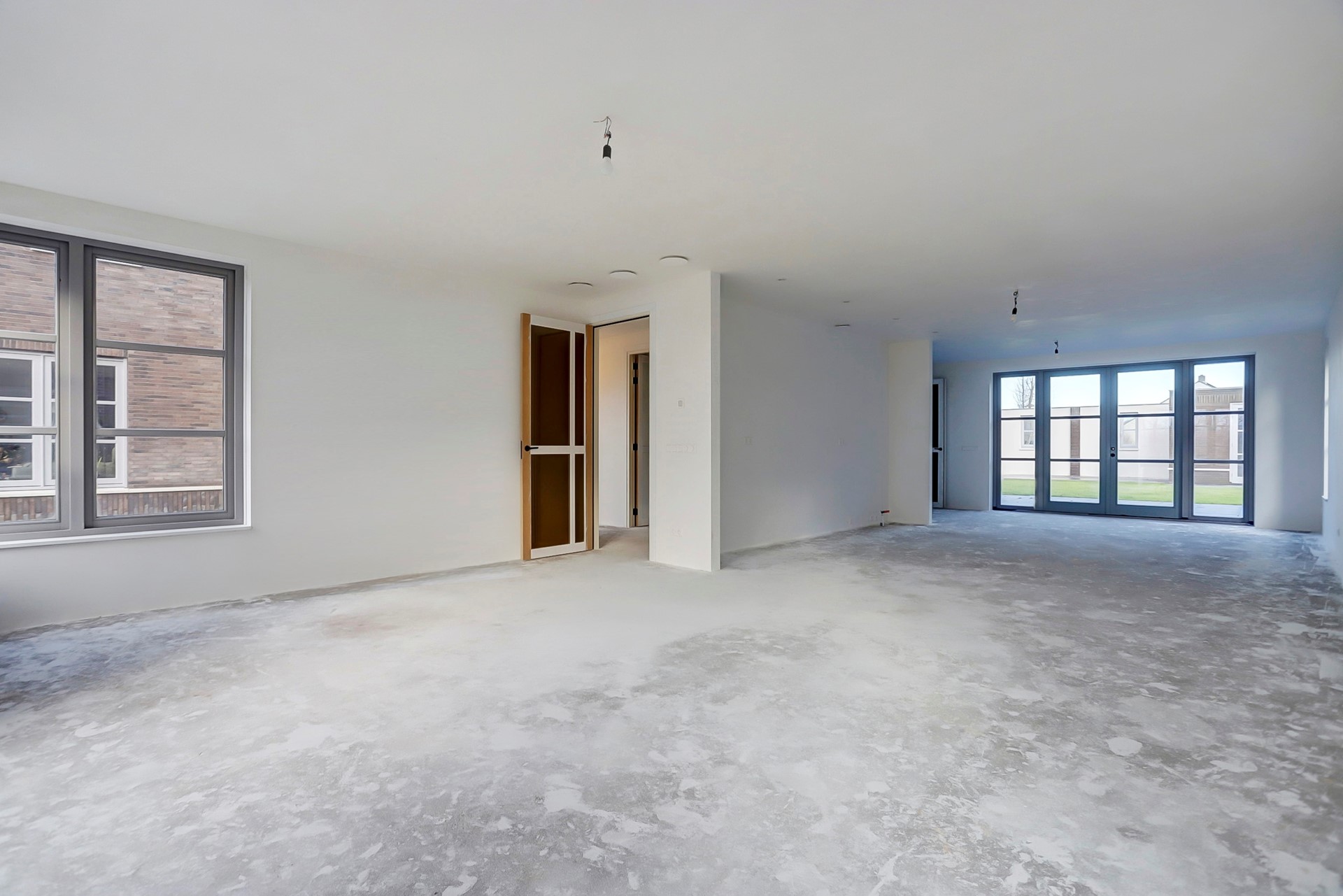 Begane grond: entree, L-vormige hal met toilet en meterkast. Vanuit de hal heeft u toegang tot de riante woonkamer welke aan de voorzijde gesitueerd is. Mede door de vele raampartijen rondom is er heerlijk veel lichtinval en heeft u tevens weids uitzicht op het aangrenzende polderlandschap. De openslaande deuren geven u toegang tot de achtertuin. In de mooie lichte open ruimte heeft u nog de volledige vrijheid om uw eigen droomkeuken te realiseren. De voorbereidingen voor een kookeiland zijn reeds getroffen.