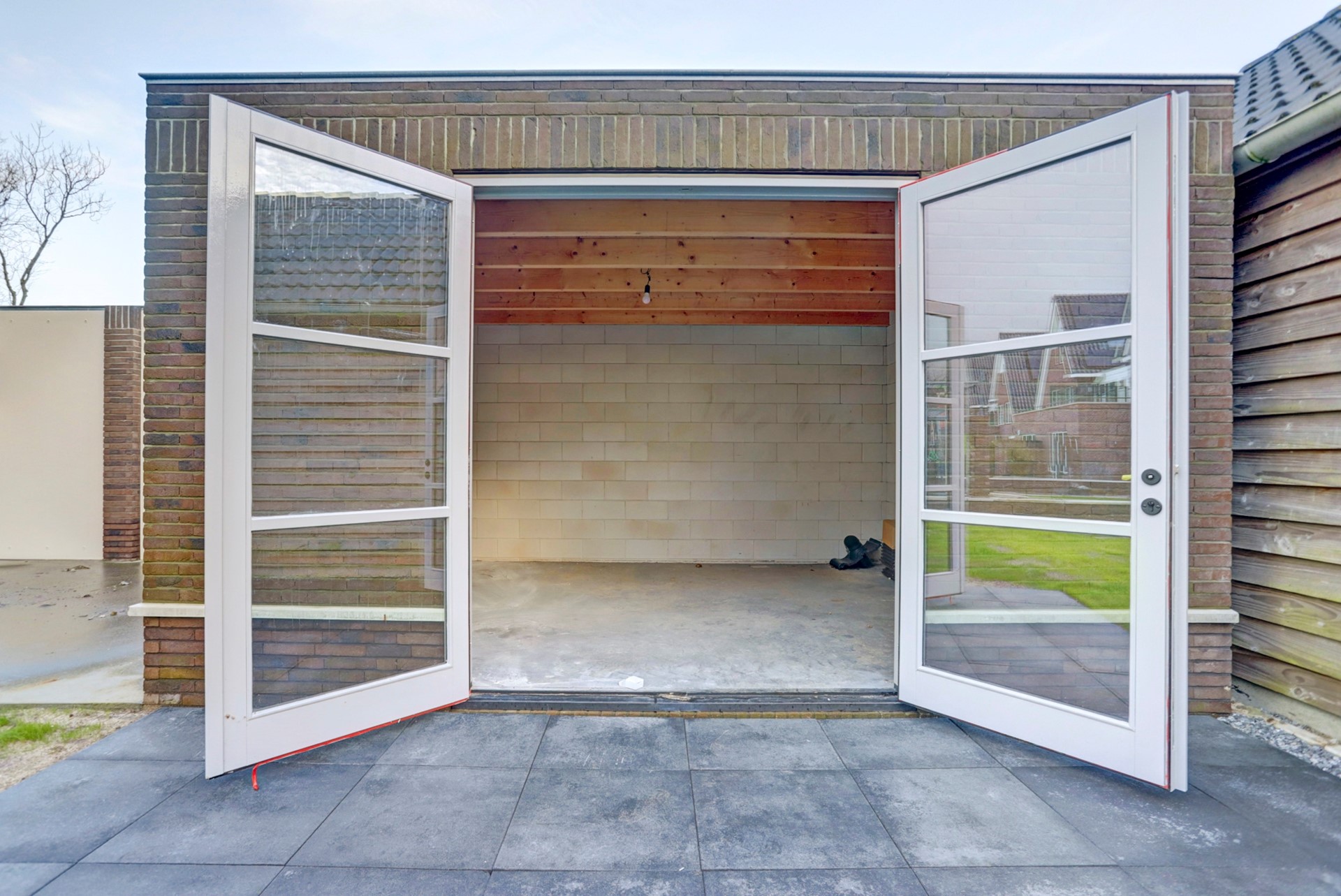 Aan de achterzijde van de woning bevindt zich een werkkamer/ hobbyruimte welke d.m.v. openslaande deuren in verbinding staat met de tuin, deze ruimte is tevens te bereiken via de hal waardoor eventuele klanten niet door het huis hoeven. Ook bevindt zich hier de opstelplaats van de technische installaties. Indien gewenst is er ook een slaapkamer en badkamer ensuite te realiseren, wat resulteert in een levensloopbestendige woning.